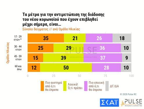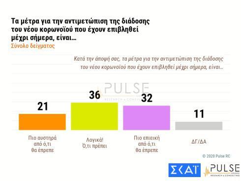 Στην ερώτηση για τα μέτρα αντιμετώπισης της διάδοσης του ιού το 21% των ερωτώμενων θεωρεί ότι είναι αυστηρότερα απ’ ό,τι θα έπρεπε, το 36% εκτιμά πως είναι λογικά/ό,τι πρέπει, ενώ το 32% που πιστεύει ότι τα μέτρα θα έπρεπε να είναι αυστηρότερα. 11% δηλώνει δεν ξέρω/δεν απαντώ.