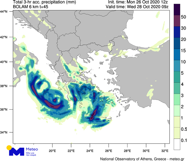 Σύμφωνα με τα διαθέσιμα προγνωστικά στοιχεία του Εθνικού Αστεροσκοπείου Αθηνών / Meteo.gr, η κακοκαιρία Κίρκη, θα επηρεάσει με τοπικά έντονες βροχές και καταιγίδες τα κεντρικά και νότια τμήματα της χώρας μας ανήμερα της Εθνικής Επετείου (Τετάρτη 28/10), όπως απεικονίζεται στους παρακάτω χάρτες.