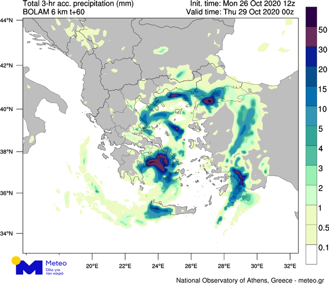 Εκτιμώμενα ύψη βροχόπτωσης (πάνω) για τις πρωινές ώρες και (κάτω) τις βραδινές ώρες της Τετάρτης 28/10/2020, σύμφωνα με το αριθμητικό μοντέλο πρόγνωσης καιρού του Εθνικού Αστεροσκοπείου Αθηνών / Meteo.gr.