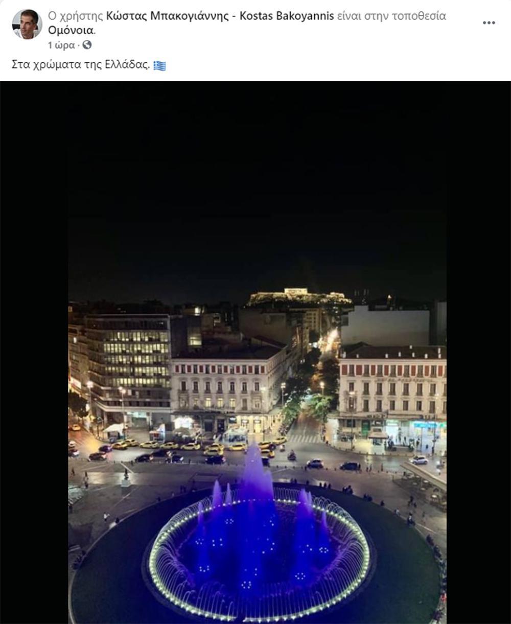 Ο δήμαρχος Αθηναίων, Κώστας Μπακογιάννης, με ανάρτησή του στα social media δημοσίευσε μία φωτογραφία και ένα βίντεο με το φωταγωγημένο συντριβάνι στο κέντρο της Αθήνας.