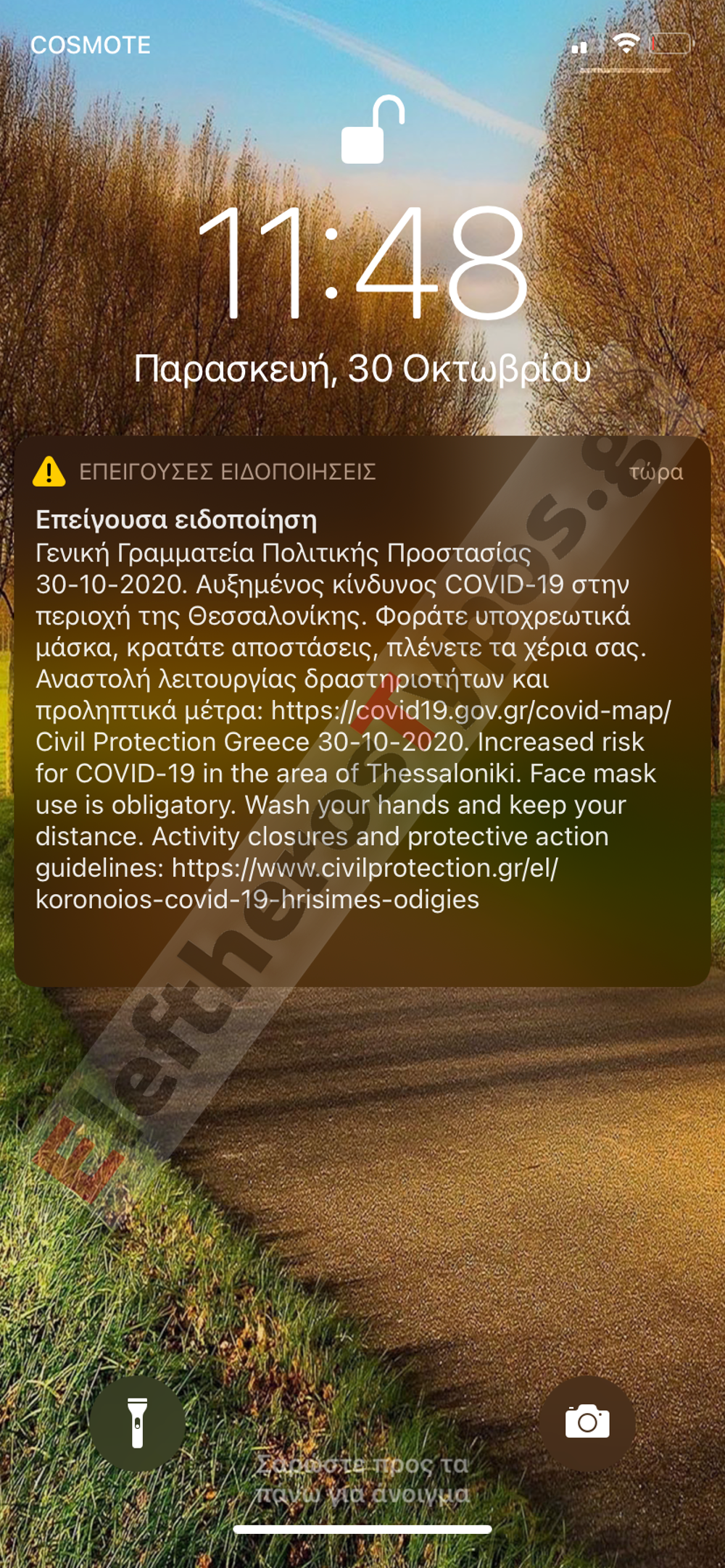 Το μήνυμα από το 112 κάνει λόγο για αυξημένο κίνδυνο κορωνοϊού στην περιοχή της Θεσσαλονίκης και απευθύνει έκκληση στους πολίτες να φορούν μάσκα, να κρατούν αποστάσεις και να πλένουν τα χέρια τους. Το μήνυμα είναι γραμμένο και στην αγγλική γλώσσα.
