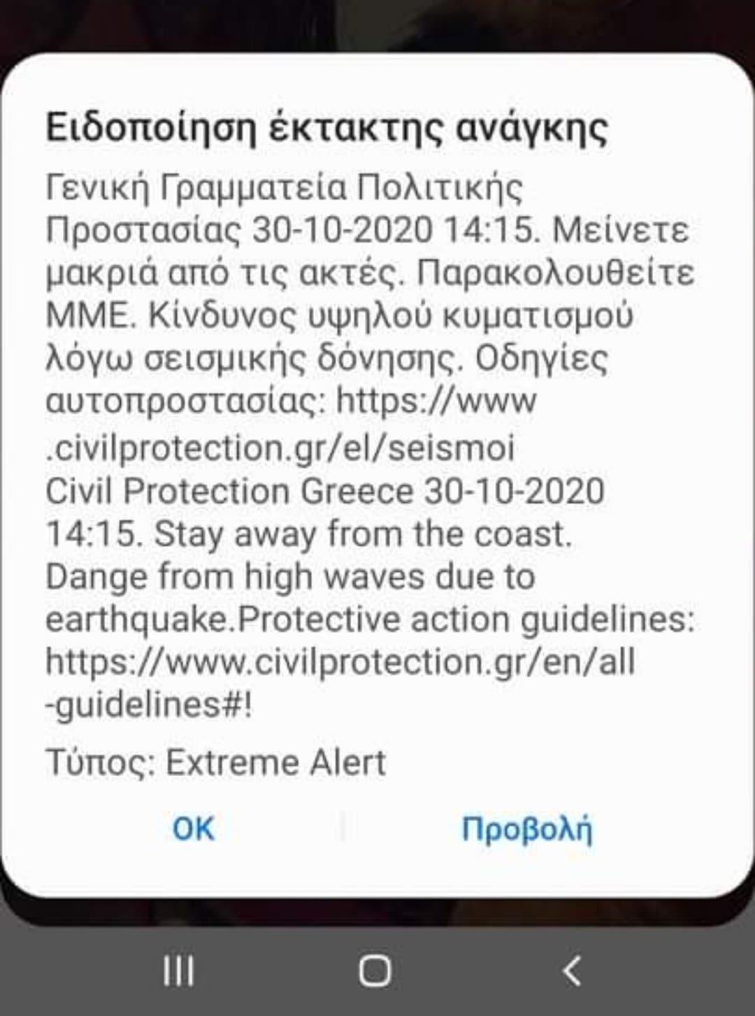 Το μήνυμα της Γενικής Γραμματείας Πολιτικής Προστασίας προειδοποιεί τους πολίτες να μείνουν μακριά από τις ακτές και να παρακολουθούν τα ΜΜΕ, ενώ παρατίθενται οδηγίες ατομικής προστασίας.