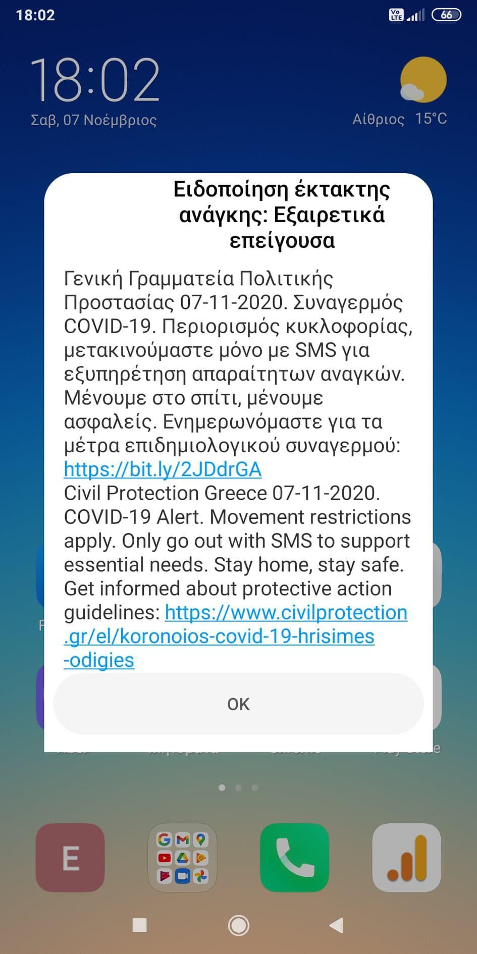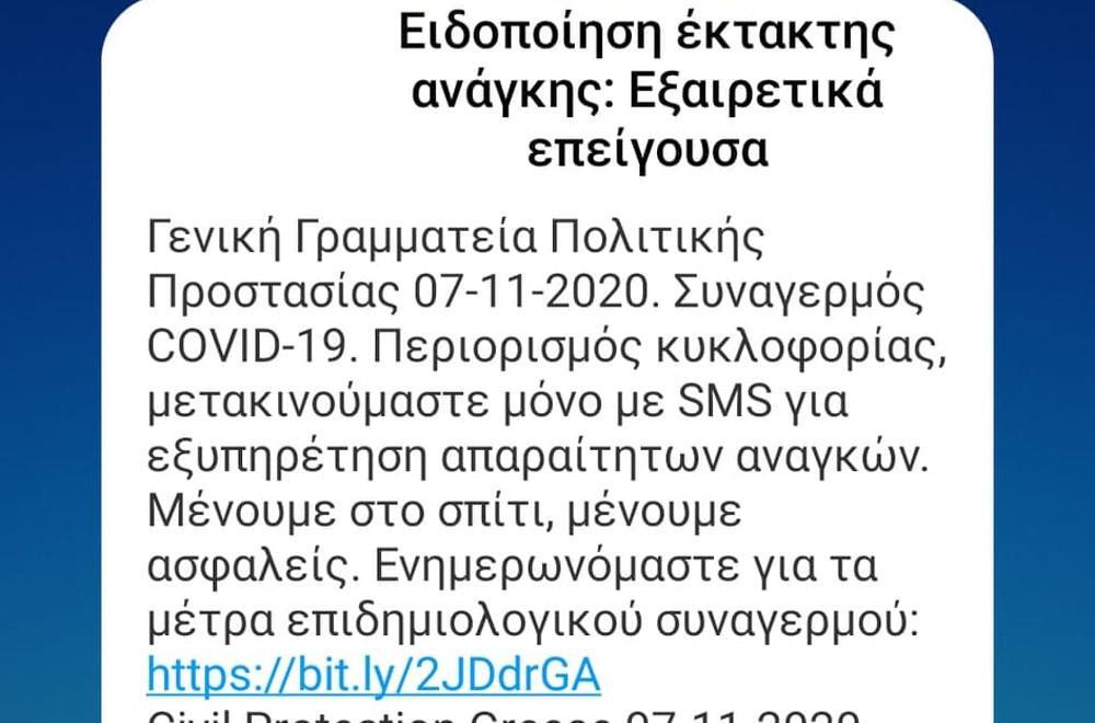 Στο μήνυμα αναφέρεται: Συγκεκριμένα το μήνυμα γράφει: Συναγερμός COVID-19. Περιορισμός κυκλοφορίας μετακινούμαστε μόνο με SMS για εξυπηρέτηση απαραίτητων αναγκών. Μένουμε στο σπίτι, μένουμε ασφαλείς. Ενημερωνόμαστε για τα μέτρα επιδημιολογικού συναγερμού.