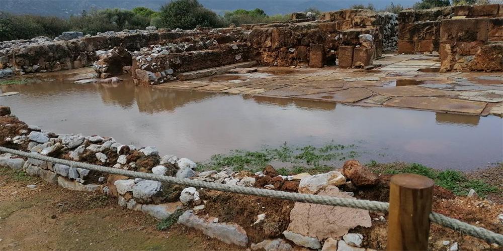 «Διαπιστώθηκε ότι η κλίση των καναλιών απορροής είναι εσφαλμένη με αποτέλεσμα να μην λειτουργούν ικανοποιητικά σε βροχή μεγάλης έντασης. Αλλά και η στάθμη του εδάφους περιμετρικά των ανεσκαμμένων χώρων είναι υψηλότερη και δεν έχουν προβλεφθεί αποστραγγιστικές τάφροι. Έτσι, τα όμβρια που απορρέουν από τα στέγαστρα και τα πέριξ αυτών, κατέληξαν στο εσωτερικό των χώρων, τόσο του Quartier Mu – συνοικία εργαστηρίων – όσο και στον παρακείμενο χώρο της Υπόστυλης Κρύπτης, παρά την ύπαρξη φρεατίου απορροής», προσθέτει το ΥΠΠΟΑ.