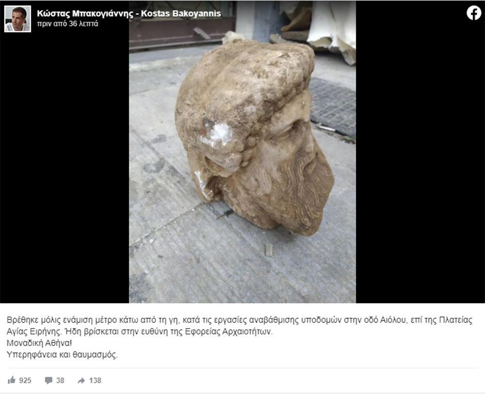 Το αρχαιολογικό εύρημα στην οδό Αιόλου ήταν θαμμένο μόλις ενάμιση μέτρο κάτω από την επιφάνεια του δρόμου. Ο δήμαρχος, Κώστας Μπακογιάννης σχολίασε στην προσωπική του σελίδα στο Facebook: