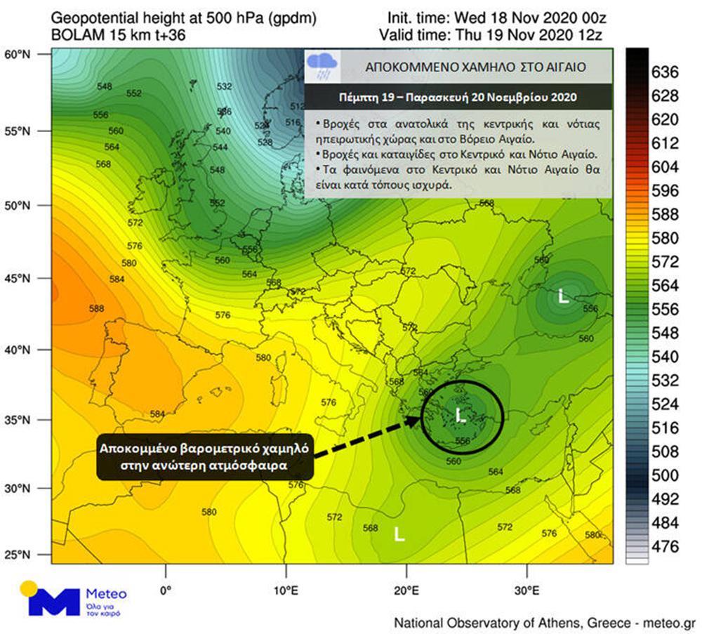 Παράλληλα, όμως, ένα άλλο αποκομμένο χαμηλό βαρομετρικό στην ανώτερη ατμόσφαιρα θα οργανωθεί έως τις πρώτες ώρες της Πέμπτης 19 Νοεμβρίου πάνω από το Αιγαίο, όπου και αναμένεται να παραμείνει στροβιλιζόμενο έως και την Παρασκευή 20 Νοεμβρίου.