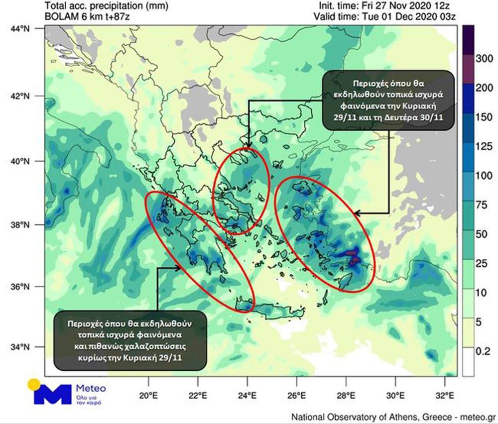 Αναλυτικότερα, αύριο αρχικά τοπικά ισχυρές βροχές και καταιγίδες θα εκδηλωθούν στο Ιόνιο, στα δυτικά ηπειρωτικά και στη Δυτική Κρήτη, περιοχές όπου υπάρχει αυξημένη πιθανότητα να εκδηλωθούν και τοπικές χαλαζοπτώσεις. Βαθμιαία οι βροχές θα επεκταθούν σχεδόν στο σύνολο της χώρας, συνοδευόμενες από καταιγίδες κυρίως στα δυτικά και νότια ηπειρωτικά, στις Κυκλάδες, στην Κρήτη και στα Δωδεκάνησα.