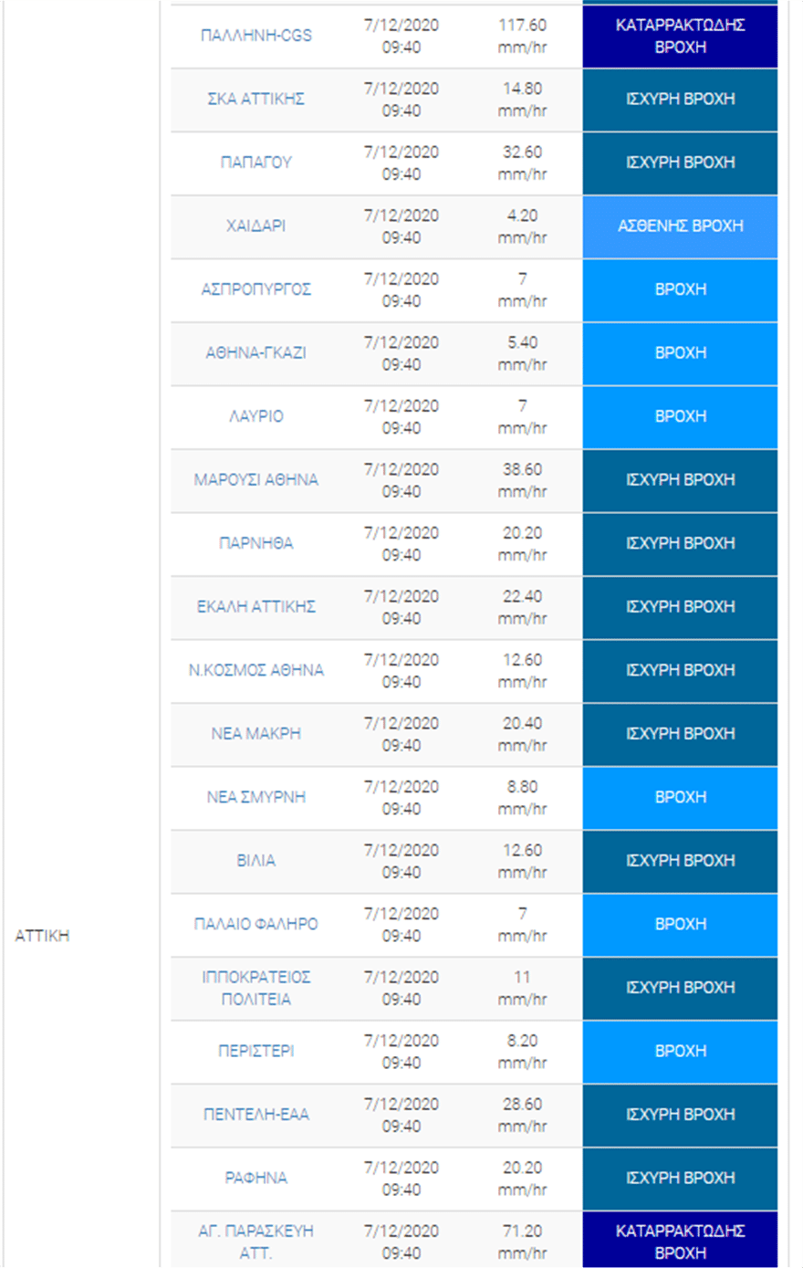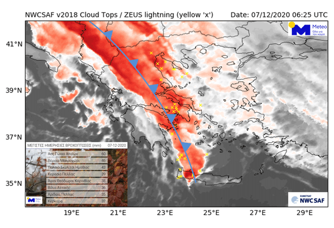 Τα μεγαλύτερα ύψη βροχής καταγράφηκαν από το δίκτυο των αυτόματων μετεωρολογικών σταθμών του Εθνικού Αστεροσκοπείου Αθηνών/Meteo.gr σε Ασή Γωνιά Χανίων (60 χιλιοστά), Μακροχώρι Βέροιας (46), Παλαιό Σκυλίτσι Ημαθίας (43), Κερασιά Πέλλας (39), Άγιοι Θεόδωροι Κορινθίας (38) και Βίλια Αττικής (36 χιλιοστά).