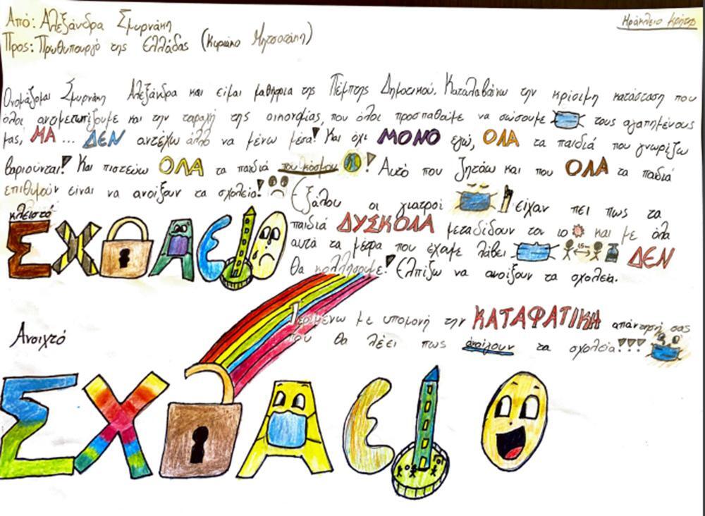 «Καταλαβαίνω την κρίσιμη κατάσταση που όλοι αντιμετωπίζουμε και την ταραχή της οικονομίας, που όλοι προσπαθούμε να σώσουμε τους αγαπημένους μας… ΜΑ δεν αντέχω άλλο να μένω μέσα! Και όχι μόνο εγώ, όλα τα παιδιά που γνωρίζω βαριούνται! Και πιστεύω όλα τα παιδιά του κόσμου! Και αυτό που ζητάω και που όλα τα παιδιά επιθυμούν είναι να ανοίξουν τα σχολεία! Εξάλλου οι γιατροί είχαν πει πως τα παιδιά δύσκολα μεταδίδουν τον ιό και με όλα αυτά τα μέτρα που έχουμε λάβει ΔΕΝ θα κολλήσουμε! Ελπίζω να ανοίξουν τα σχολεία», γράφει η Αλεξάνδρα, προειδοποιώντας ουσιαστικά στην κατακλείδα του γράμματός της τον Κυριάκο Μητσοτάκη: