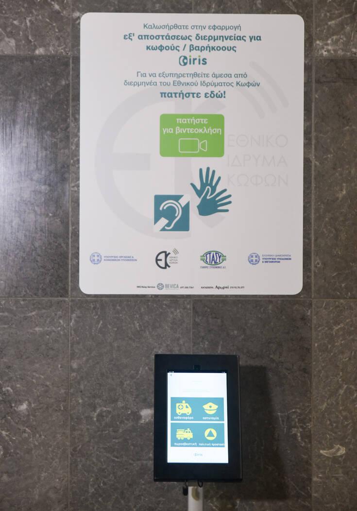 Ο σταθμός επικοινωνίας για κωφούς και βαρήκοους είναι ουσιαστικά ένα «tablet», το οποίο έχει ενσωματωμένη την εφαρμογή «iris» (relay service), που είναι μία εξ αποστάσεως παροχή τηλεδιερμηνείας για κωφούς και βαρήκοους και λειτουργεί σε 24ωρη βάση στο Εθνικό ίδρυμα Κωφών (ΕΙΚ).