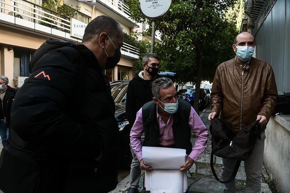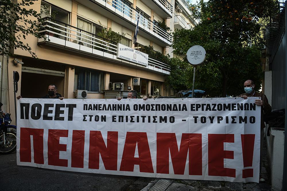 Οι εργαζόμενοι, φορώντας μάσκες και έχοντας στείλει μηνύματα για την έξοδό τους, κατέβηκαν την Ηρώδου Αττικού και έφτασαν απέναντι από το Μέγαρο Μαξίμου όπου άνοιξαν το πανό.
