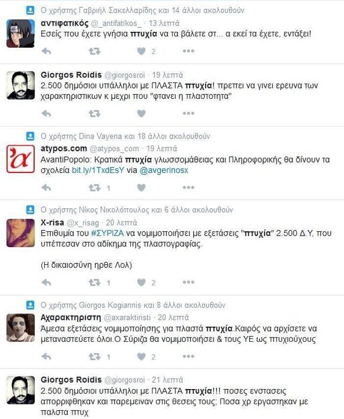 «Εντύπωση προκαλούν τα δημοσιεύματα που αναφέρονται σε ενδεχόμενη νομιμοποίηση από την κυβέρνηση των δημοσίων υπαλλήλων που είναι κάτοχοι πλαστών τίτλων σπουδών, κατόπιν υποβολής τους σε εξετάσεις προκειμένου να πιστοποιηθούν οι γνώσεις τους. Οι πλαστοί τίτλοι έδωσαν τη δυνατότητα στους υπαλλήλους αυτούς να συμμετάσχουν σε διαγωνισμούς του ΑΣΕΠ και να εργάζονται σήμερα στο Δημόσιο, καταλαμβάνοντας θέσεις τις οποίες κανονικά θα έπρεπε να έχουν καταλάβει υποψήφιοι με πραγματικά προσόντα.