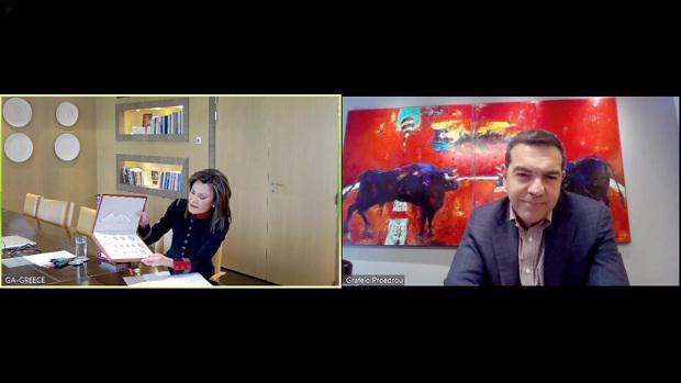 Τέλος, παρουσίασε στους πολιτικούς Αρχηγούς των κομμάτων της Αντιπολίτευσης το Νομισματικό Πρόγραμμα της Επιτροπής. Αυτό αποτελείται από 14 νομίσματα σπάνιας συλλεκτικής αξίας που απεικονίζουν εμβληματικές στιγμές της ελληνικής ιστορίας και αποτελεί το κύριο μέσο της Επιτροπής για τη χρηματοδότηση περισσότερων δράσεων για την επέτειο.