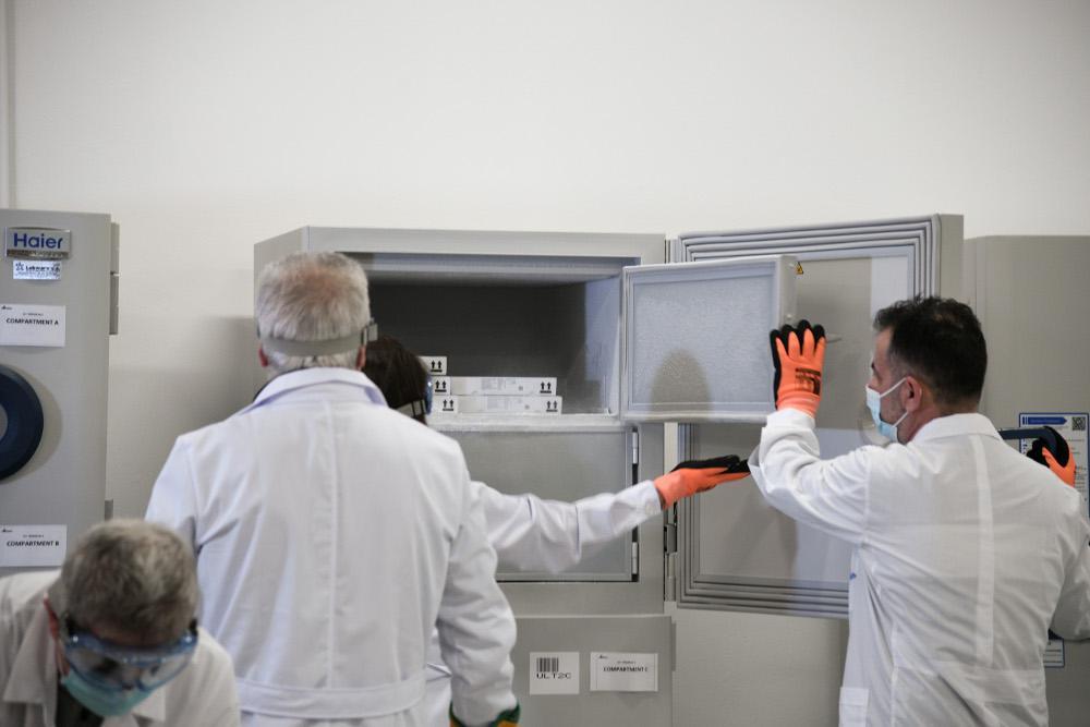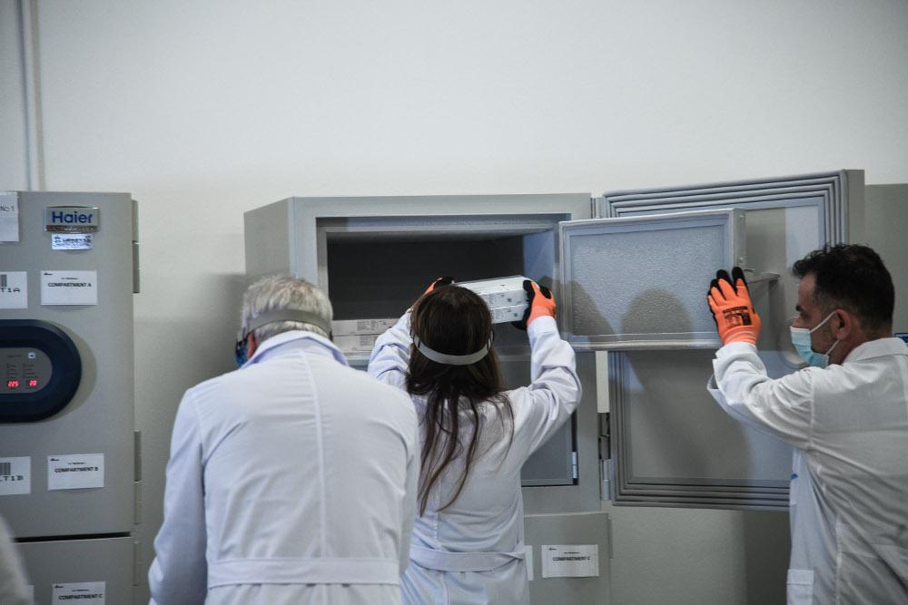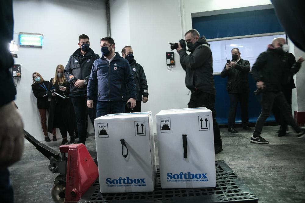 Τα εμβόλια παραδόθηκαν στο χώρο αποθήκευσης υπό δρακόντεια μέτρα υψίστης ασφαλείας παρουσία του υφυπουργού Πολιτικής Προστασίας και Διαχείρισης Κρίσεων, Νίκου Χαρδαλιά, του υφυπουργού Υγείας, Βασίλη Κοντοζαμάνη και του γενικού γραμματέα Πρωτοβάθμιας Φροντίδας Υγείας, Μάριου Θεμιστοκλέους.