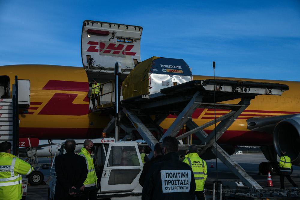Κλιμάκιο του υπουργείου Υγείας και της Πολιτικής Προστασίας με επικεφαλής τον υφυπουργό Πολιτικής Προστασίας και Διαχείρισης Κρίσεων, Νίκο Χαρδαλιά, καθώς και εκπρόσωποι των Ενόπλων Δυνάμεων, της Αστυνομίας και της Πυροσβεστικής βρίσκονται στο αεροδρόμιο προκειμένου να παραλάβουν τις δόσεις του εμβολίου.