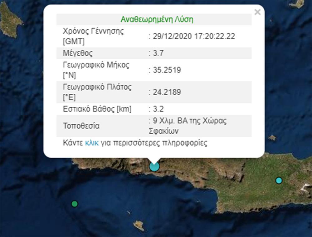 Η δόνηση είχε εστιακό βάθος 3,2 χλμ και επίκεντρο που εντοπίζεται στα 9 χλμ βορειοανατολικά της χώρας Σφακίων.