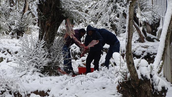 Εν τούτοις, για τρίτη μέρα σήμερα, εκατοντάδες άνθρωποι παραμένουν εκτεθειμένοι στο κρύο και στο χιόνι, αφού ο χιονιάς και η κακοκαιρία που πλήττουν την χώρα μας έπληξαν και την Λέσβο. Το χιόνι στον καταυλισμό κάλυψε τα πάντα, ακόμα και τις καλοκαιρινές σκηνές στις οποίες πρόσφυγες και μετανάστες προσπαθούν να προστατευτούν. Την επομένη του χιονιά, ο ήλιος που βγήκε μετέτρεψε το χιόνι σε πάγο, καθώς το κρύο ήταν τσουχτερό, με αποτέλεσμα οι άνθρωποι αυτοί, που κινδυνεύουν από κρυοπαγήματα ζώντας έξω στην παγωνιά, τώρα να έχουν να αντιμετωπίσουν ακόμα μία δυσκολία. Καθώς οι περισσότεροι προέρχονται από περιοχές που δεν είναι συνηθισμένα τέτοια καιρικά φαινόμενα, δεν γνωρίζουν πώς να κινηθούν πάνω στο παγωμένο, και πολύ επικίνδυνο, έδαφος!