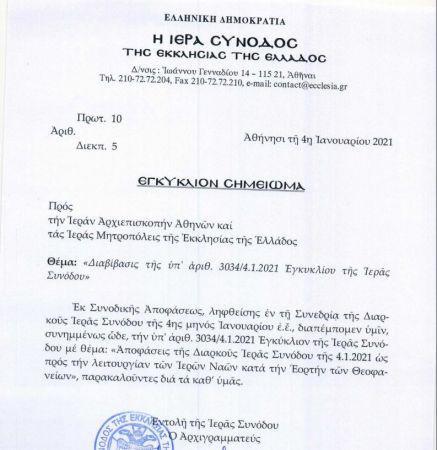 Η εγκύκλιος της Ιεράς Συνόδου της Εκκλησίας της Ελλάδος έχει ημερομηνία 4 Ιανουαρίου 2021 και σε αυτή μεταξύ άλλων αναφέρεται ότι: