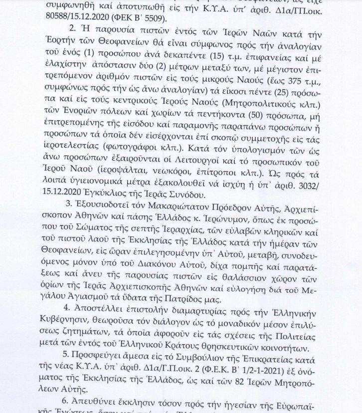 1. Δεν συναινεί στα νέα Κυβερνητικά μέτρα ως προς τη λειτουργία των Ιερών Ναών, εμμένει σε όσα συμφωνήθηκαν αρχικώς με την Πολιτεία και εντέλλεται οι Ιεροί Ναοί να παραμείνουν ανοικτοί για την συμμετοχή των πιστών στη Θεία Λειτουργία και τον Αγιασμό των υδάτων εντός των Ιερών Ναών της Εορτής των Θεοφανείων όπως άλλωστε είχε συμφωνηθεί και αποτυπωθεί στην Κ.Υ.Α. υπ’ αριθμ. Δ1α/ΓΠ.οικ. 80588/15.12.2020 (ΦΕΚ Β΄ 5509).