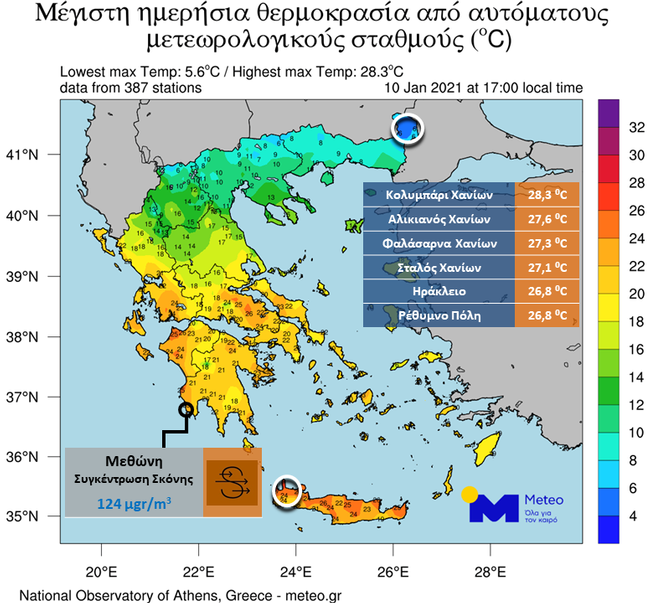 Οι μέγιστες θερμοκρασίες της Κυριακής 10/01, όπως κατεγράφησαν από το δίκτυο αυτόματων μετεωρολογικών σταθμών του Εθνικού Αστεροσκοπείου Αθηνών / Meteo.gr, καθώς επίσης και ο πίνακας με τις έξι υψηλότερες μέγιστες τιμές παρουσιάζονται στον παρακάτω Χάρτη.