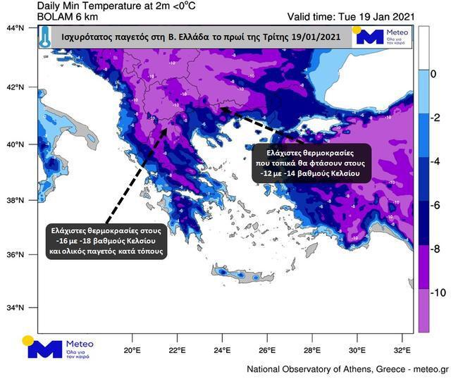 Σύμφωνα με τα προγνωστικά δεδομένα του Εθνικού Αστεροσκοπείου Αθηνών / meteo.gr ο υδράργυρος αναμένεται να πέσει στα επίπεδα των -16 με -18 βαθμών Κελσίου στη Δυτική Μακεδονία και στα επίπεδα των -12 με -14 βαθμών Κελσίου στα υπόλοιπα τμήματα της Μακεδονίας.