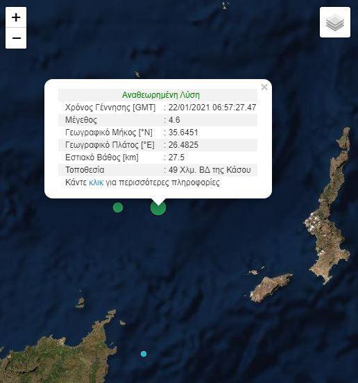 Το επίκεντρο της δόνησης εντοπίζεται 49χλμ βορειοδυτικά της Κάσου, σε θαλάσσια περιοχή. Το εστιακό βάθος υπολογίζεται σε 27,5χλμ. Η δόνηση σημειώθηκε στις 08:57πμ.