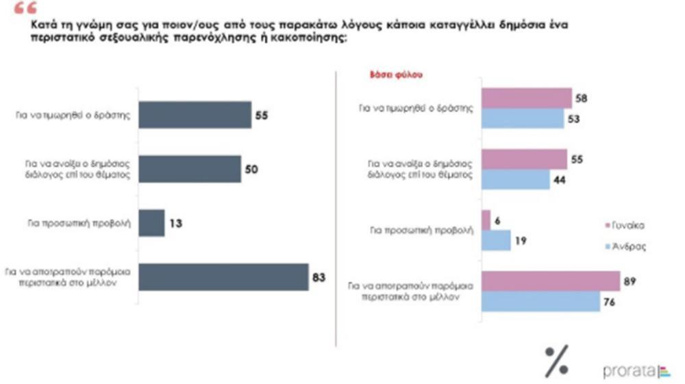 Οι περισσότεροι συμμετέχοντες δηλώνουν πως κατά την άποψη τους ο κύριος λόγος για τον οποίο μια γυναίκα καταγγέλλει δημόσια ένα περιστατικό παρενόχλησης ή κακοποίησης είναι ώστε να αποτραπούν παρόμοια περιστατικά στο μέλλον. Παράλληλα, οι ερωτώμενοι συμμερίζονται με τρόπο καθολικό (87%) την άποψη ότι δεν είναι καθόλου εύκολο ή όχι ιδιαίτερα εύκολο να δικαιωθεί μια γυναίκα που έχει υπάρξει θύμα σεξουαλικής παρενόχλησης ή κακοποίησης.