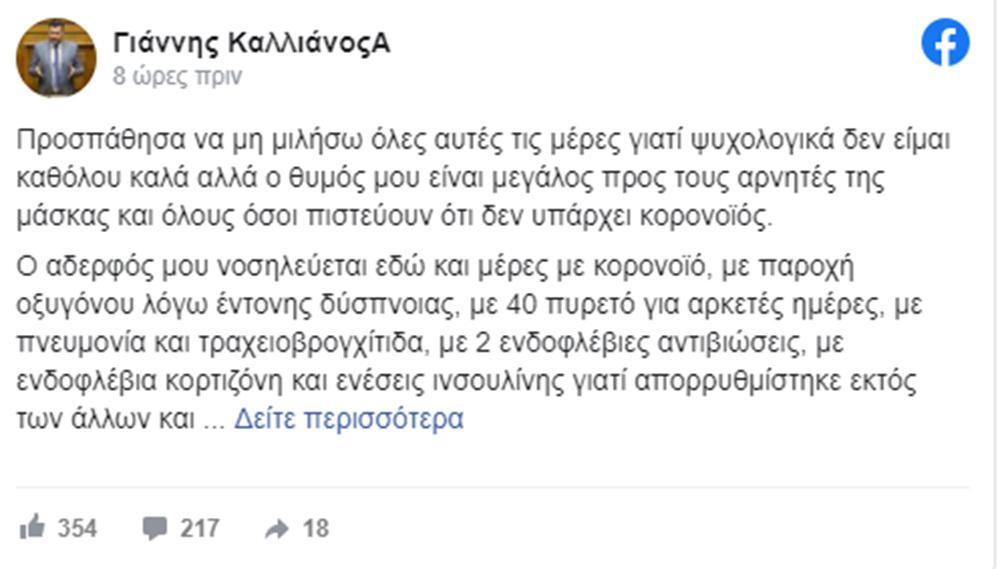 Έχω να τους εξηγήσω πολλά! Όλοι εσείς που είστε αρνητές θα σας παρακαλέσω να σοβαρευτείτε! Είναι ένας εφιάλτης αυτός ο ιός. Να είστε υπεύθυνοι και να προστατεύετε τους εαυτούς σας και τους δικούς σας ανθρώπους σας παρακαλώ πάρα πολύ. Όλοι εσείς οι αρνητές ελάτε μια μέρα να καλέσουμε στο τηλέφωνο τον αδερφό μου για να δείτε πως μιλάει. Θα σας κοπεί ο τσαμπουκάς και η εξυπνάδα δια παντός… Ευχαριστώ τους γιατρούς και το Θεό…».
