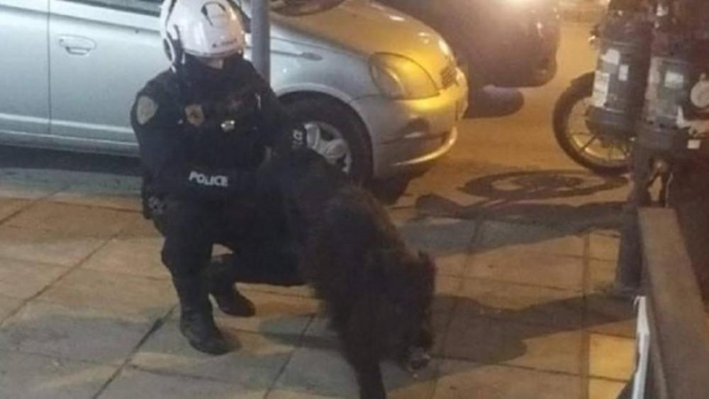 Δυνάμεις της ΕΛΑΣ που έσπευσαν στο σημείο ενημέρωσαν τη φιλοζωική και μέχρι να γίνει η παραλαβή του άγριου ζώου, ένας εκ των αστυνομικών το συγκρατούσε από τα πόδια, όπως φαίνεται και στις φωτογραφίες που δημοσιεύθηκαν στη σελίδα του Northmeteo.gr στο Facebook.