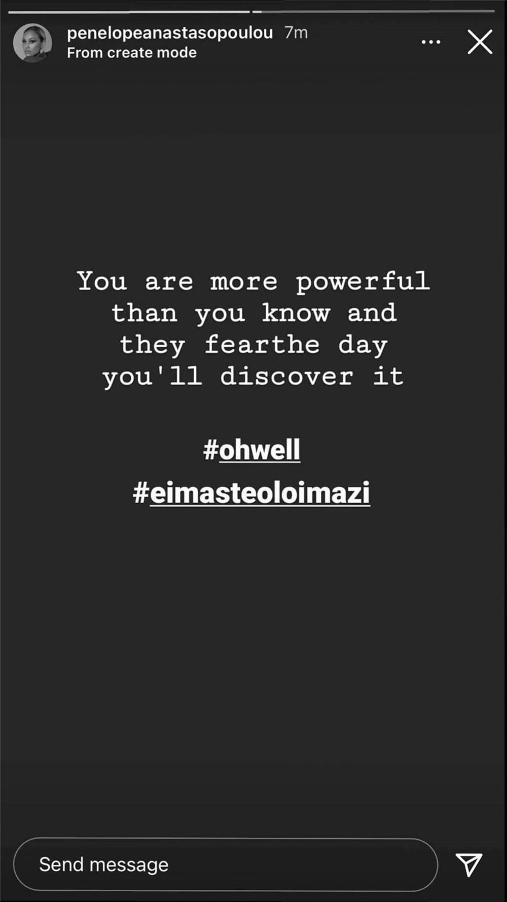 Λίγα λεπτά με την παραπάνω ανακοίνωση, ακολούθησε μία ανάρτηση της ηθοποιού Πηνελόπης Ανασταστοπούλου, στην οποία ανέφερε: «Είσαι πιο ισχυρή από ό, τι γνωρίζεις και φοβούνται τη μέρα που θα το ανακαλύψεις».