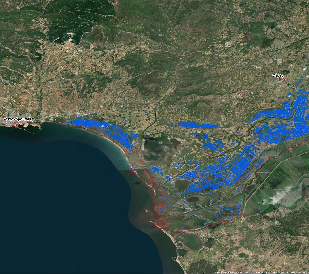 Επιπλέον, το Κέντρο παρείχε ξεχωριστό χάρτη, επικεντρωμένο στην περιοχή μεταξύ της Αλεξανδρούπολης και του Δέλτα του Εβρου, όπου παραμένουν πλημμυρισμένα 40.925 στρέμματα (4.093 εκτάρια), τα οποία είναι κυρίως αγροτικές και καλλιεργούμενες εκτάσεις (70,1%). Στη συγκεκριμένη περιοχή βρίσκονται τα τρία χωριά τα οποία πλημμύρισαν. Από τα στελέχη του Κέντρου αξιοποιήθηκε δορυφορική εικόνα Sentinel-1A, η οποία ελήφθη στις 06:22 της Τρίτης 2 Φεβρουαρίου. Το χαρτογραφικό προϊόν δημιουργήθηκε μέσω προεπεξεργασίας των δορυφορικών εικόνων και εφαρμογής κατάλληλων κατωφλιών με παράλληλη φωτοερμηνεία των εικόνων.
