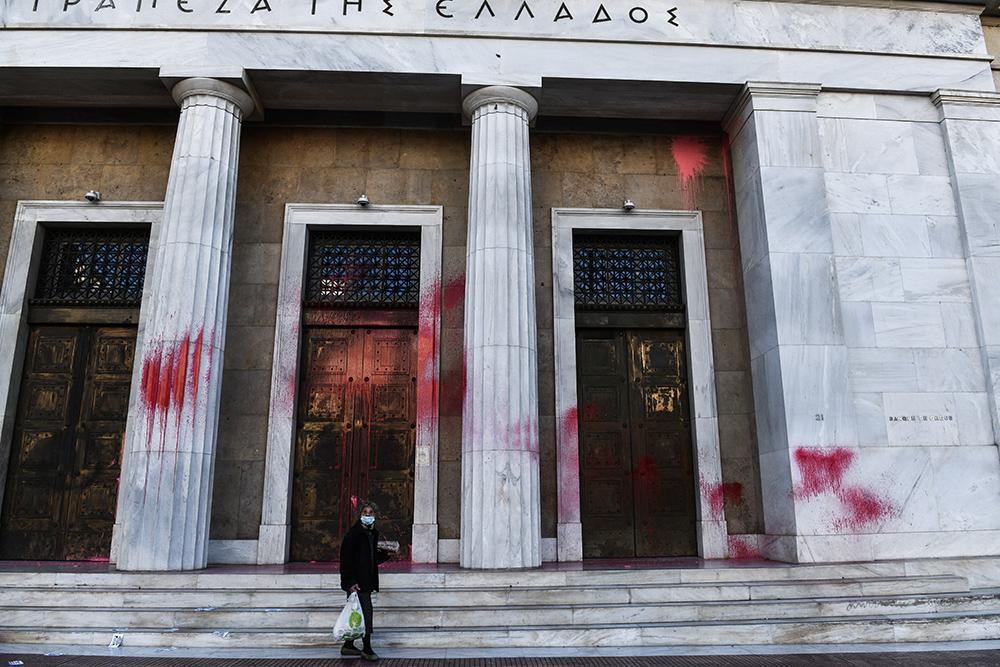 Ομάδα διαδηλωτών έριξε μια βόμβα μολότοφ καθώς και κόκκινες μπογιές εναντίον των δυνάμεων των ΜΑΤ στο ύψος της Βουλής, στην πλατεία Συντάγματος, ενώ στη συνέχεια -και κατά την αποχώρηση τους- διαδηλωτές πέταξαν κόκκινες μπογιές στο κτήριο της Τράπεζας της Ελλάδος στην Πανεπιστημίου.
