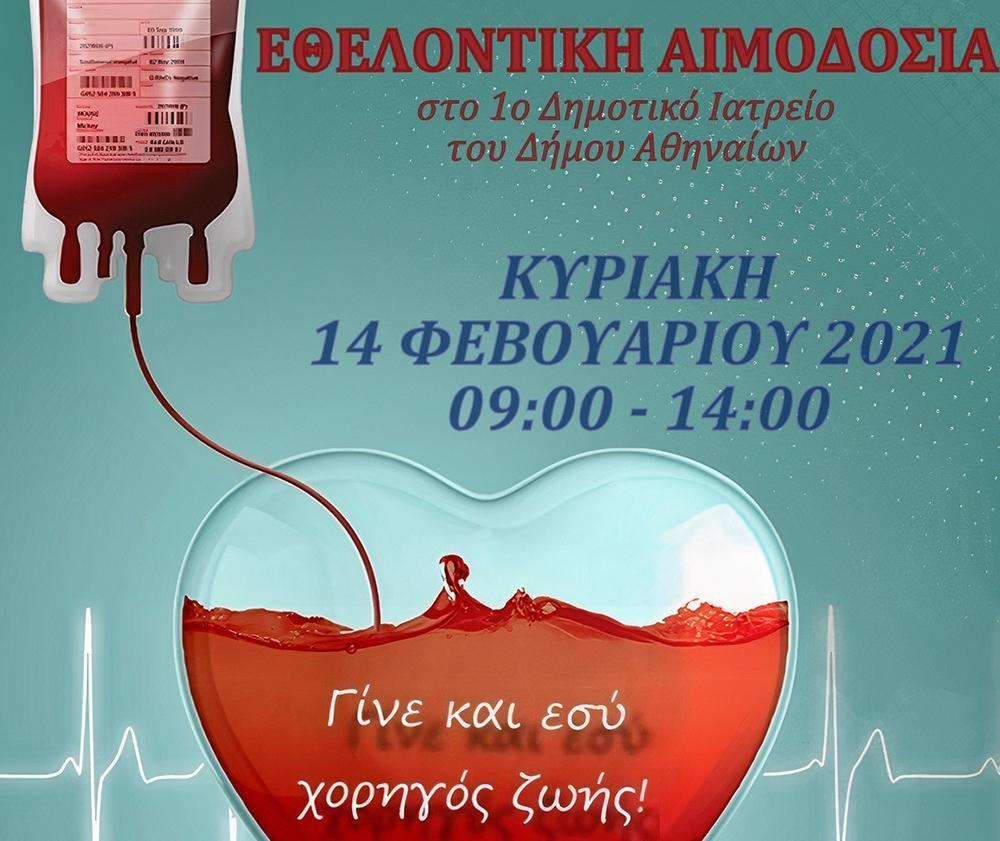 Η αιμοδοσία θα πραγματοποιηθεί την Κυριακή 14 Φεβρουαρίου 2021 στο 1ο Δημοτικό Ιατρείο στην οδό Σόλωνος 78 και ώρα 09:00–14:00. Τηλέφωνο Ιατρείου για ραντεβού: 210-3626587