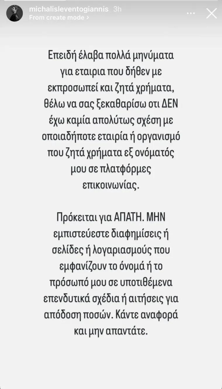 «Επειδή έλαβα πολλά μηνύματα για εταιρεία που δήθεν με εκπροσωπεί και ζητά χρήματα, θέλω να σας ξεκαθαρίσω ότι ΔΕΝ έχω καμία απολύτως σχέση με οποιαδήποτε εταιρεία η οργανισμό που ζητά χρήματα εξ’ ονόματός μου σε πλατφόρμες επικοινωνίας.