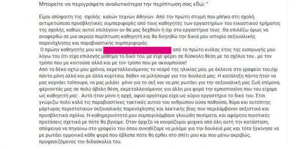 Τα περιστατικά έρχονται στο πλαίσιο ανώνυμων καταγγελιών που γίνονται μέσω πλατφόρμας την οποία δημιούργησε στο Facebook η Φοιτητική Πρωτοβουλία Καταγραφής Παρενοχλήσεων στην Ανωτάτη Σχολή Καλών Τεχνών (ΑΣΚΤ).