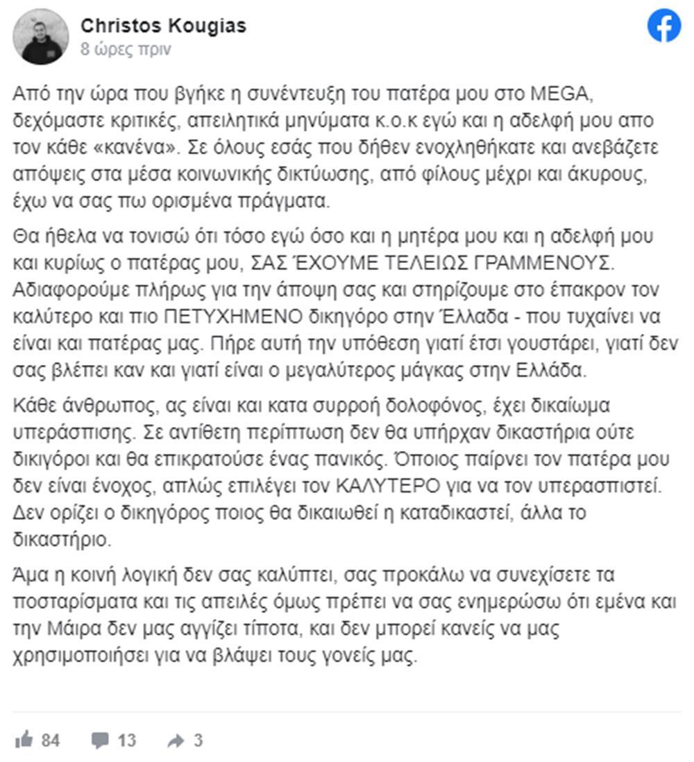 «Από την ώρα που βγήκε η συνέντευξη του πατέρα μου στο MEGA, δεχόμαστε κριτικές, απειλητικά μηνύματα κ.ο.κ εγώ και η αδελφή μου από τον κάθε «κανένα». Σε όλους εσάς που δήθεν ενοχληθήκατε και ανεβάζετε απόψεις στα μέσα κοινωνικής δικτύωσης, από φίλους μέχρι και άκυρους, έχω να σας πω ορισμένα πράγματα.