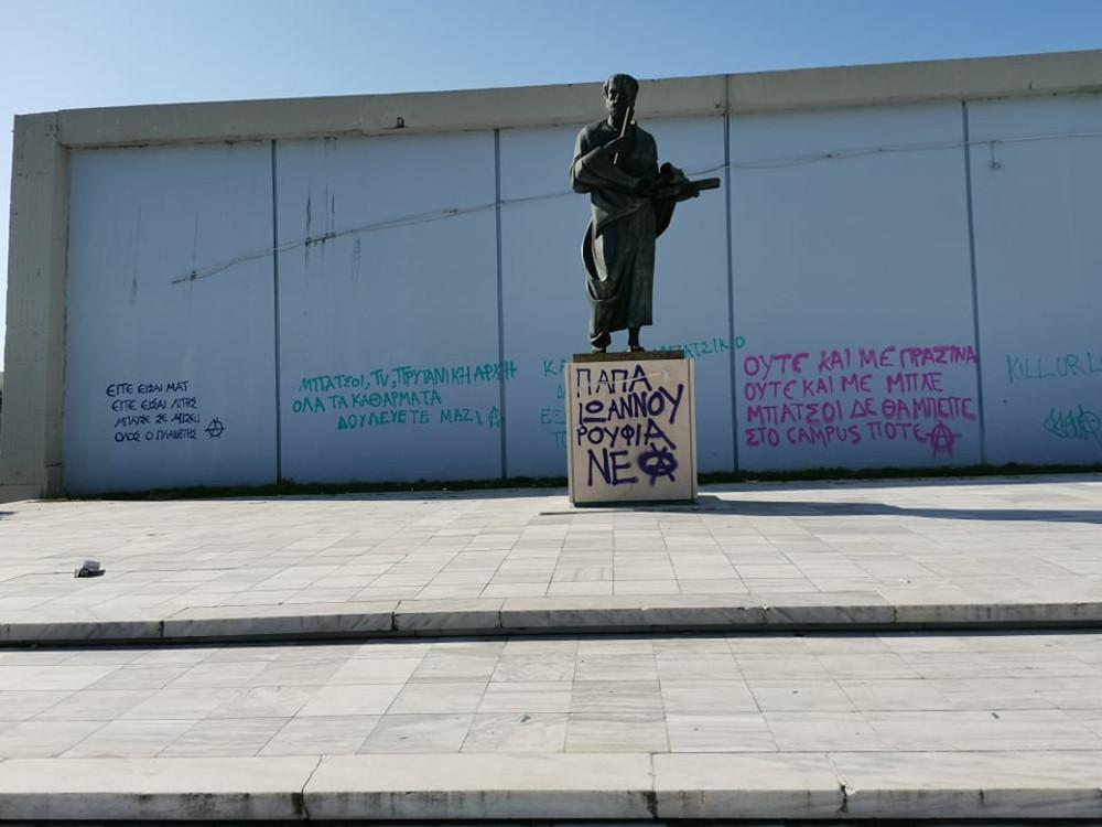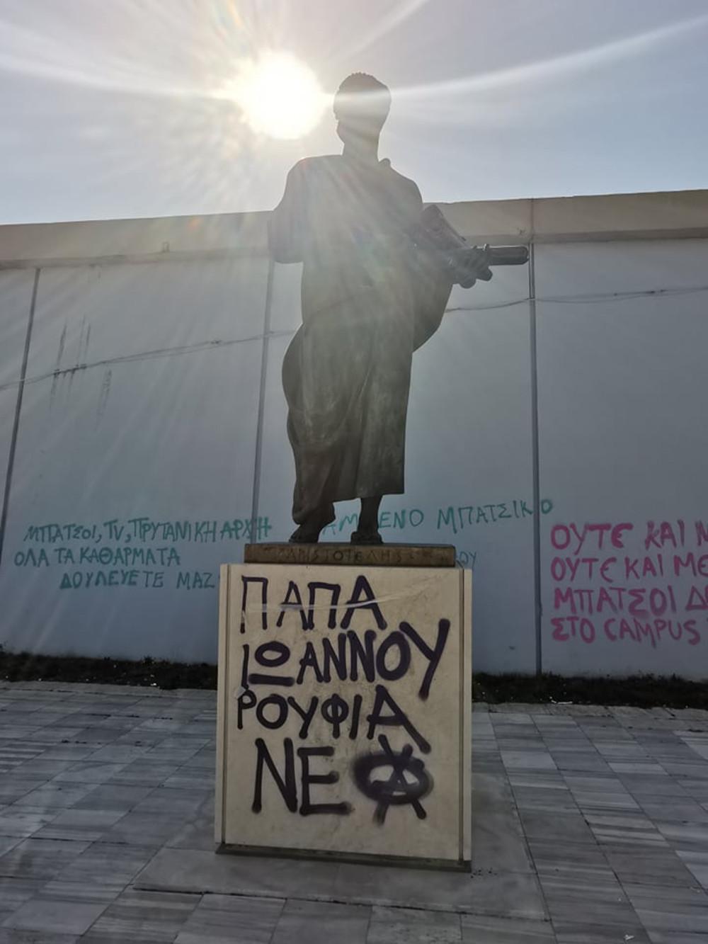 Με σπρέι έγραψαν υβριστικό σύνθημα κατά του πρύτανη του ΑΠΘ, Νίκου Παπαϊωάννου, ενώ αντίστοιχα συνθήματα υπάρχουν και στον τοίχο της αίθουσας τελετών που βρίσκεται σε απόσταση λίγων μέτρων από το άγαλμα.