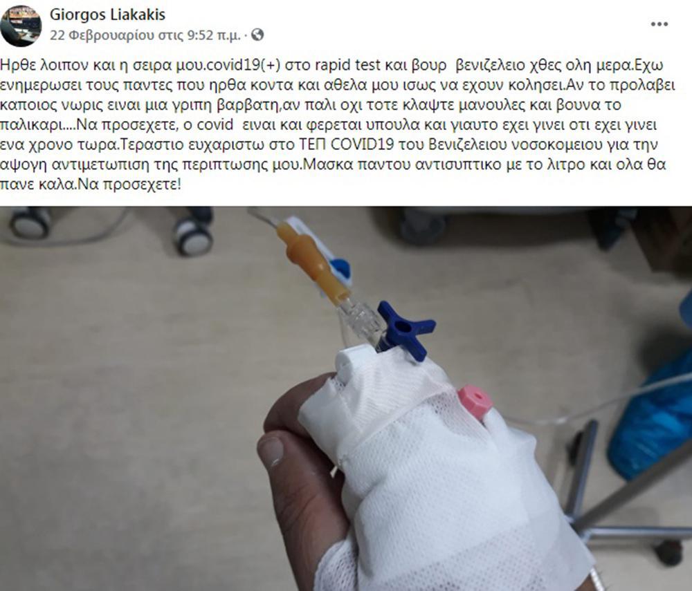 «Ήρθε λοιπόν και η σειρά μου.covid19(+) στο rapid test και βουρ βενιζελειο χθες όλη μέρα. Έχω ενημερώσει τους πάντες που ήρθα κοντά και άθελά μου ίσως να έχουν κολλήσει. Αν το προλάβει κάποιος νωρίς είναι μια γρίπη βαρβάτη, αν πάλι όχι τότε κλάψτε μανούλες και βουνά το παλικάρι….