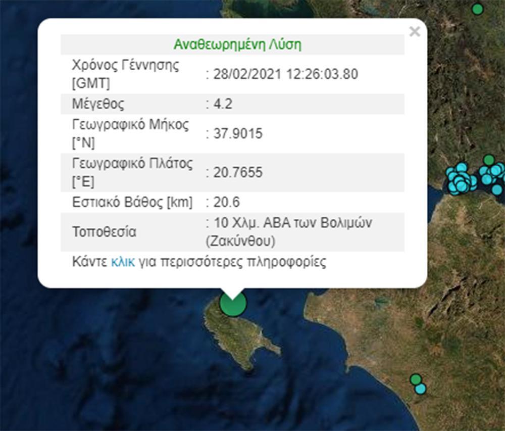 Το επίκεντρο του σεισμού τοποθετείται 10χλμ ανατολικά – βορειανατολικά των Βολιμών Ζακύνθου.