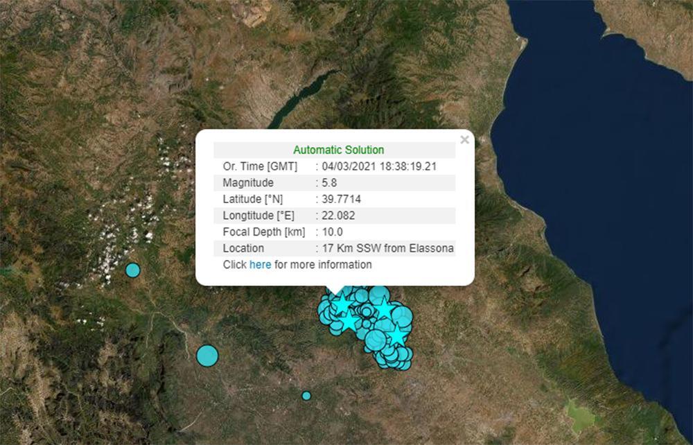 Το επίκεντρο της δόνησης εντοπίζεται 17 χιλιόμετρα νοτιοδυτικά της Ελασσόνας, στην ευρύτερη περιοχή του Τυρνάβου, όπου σημειώθηκε και ο σεισμός των 6 Ρίχτερ χθες, Τετάρτη.