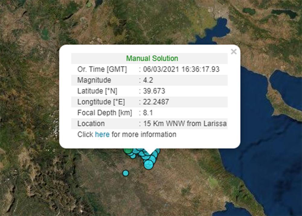 Το Γεωδυναμικό Ινστιτούτο του Εθνικού Αστεροσκοπείου Αθηνών, εκ μέρους των φορέων συγκρότησης του Ενιαίου Εθνικού Σεισμολογικού Δικτύου, ανακοίνωσε ότι ο σεισμός έγινε σε απόσταση 228 χλμ. ΒΒΔ της Αθήνας.