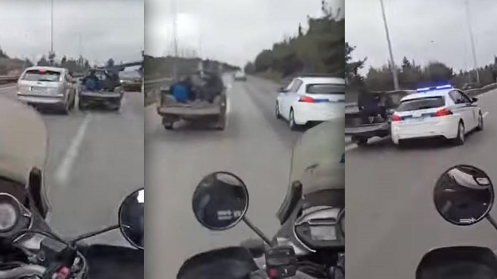 Περιπολικό και μηχανές της αστυνομίας καταδιώκουν αγροτικό στην εθνική οδό Θεσσαλονίκης – Μουδανιών το μεσημέρι της Κυριακής. Μέσα στο όχημα βρίσκονται 4 ληστές, με τους δύο μάλιστα να κάθονται γαντζωμένοι στην καρότσα. Οι αστυνομικοί τους κάνουν νόημα να σταματήσουν.
