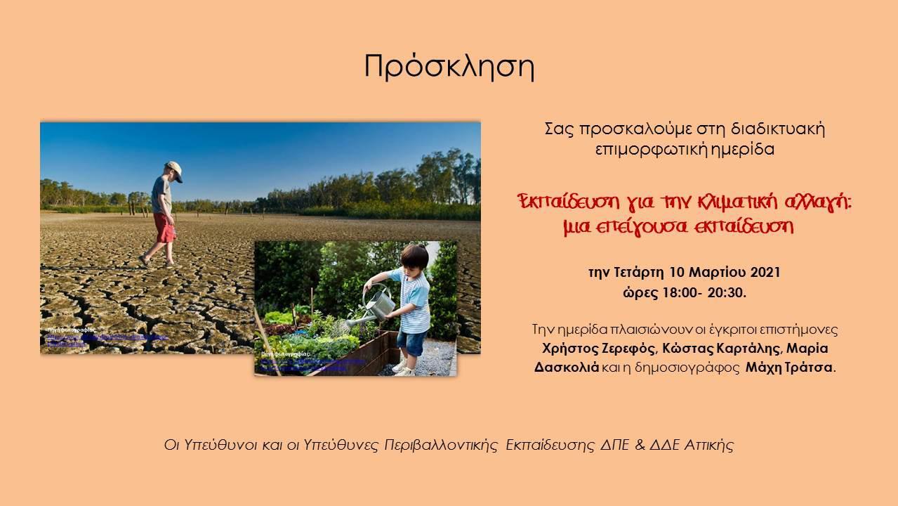 Σκοπός της επιμορφωτικής ημερίδας είναι να ανοίξει η συζήτηση για την Κλιματική Εκπαίδευση, μια εκπαίδευση αναγκαία για το σχολείο, ώστε η σχολική κοινότητα ως ολότητα να συνειδητοποιήσει τους κινδύνους από την κλιματική αλλαγή, να σχεδιάσει τρόπους προσαρμογής στα ακραία κλιματικά φαινόμενα και να υιοθετήσει συμπεριφορές φιλικές προς το περιβάλλον που θα συμβάλλουν στον μετριασμό της κλιματικής αλλαγής. Μια εκπαίδευση εξίσου αναγκαία και καθοριστική για ολόκληρη την κοινωνία, αφού μόνο μέσα από την καθολική συστράτευση μπορεί να αντιμετωπιστεί η κλιματική κρίση.