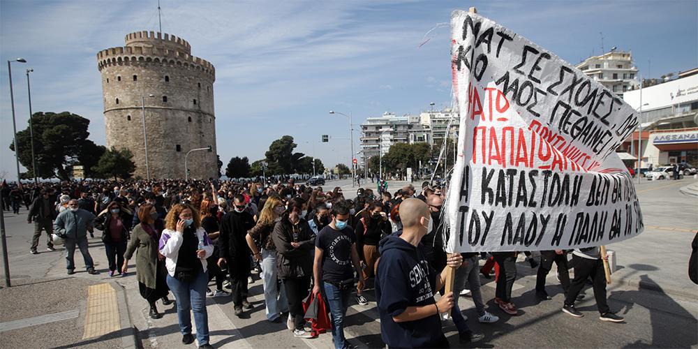 Συγκέντρωση στο Λευκό Πύργο στις δώδεκα το μεσημέρι και πορεία στο κέντρο της πόλης πραγματοποίησαν φοιτητές, πρωτοβουλίες αλληλεγγύης και κινήσεις του αντιεξουσιαστικού χώρου, ενάντια στην αστυνομική βία και το νέο νόμο για τις ανώτατες σχολές. Οι διαδηλωτές κρατούσαν πανό και πλακάτ με συνθήματα, όπως, «έξω η αστυνομία από τις σχολές», «κανένας απεργός πείνας νεκρός», άλλα συνθήματα ενάντια στην «κρατική καταστολή» κ.ο.κ..