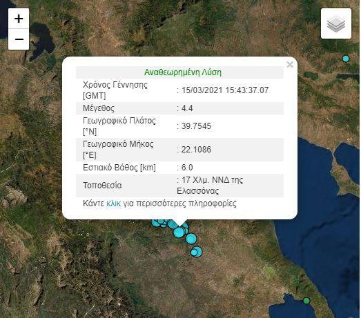 Η σεισμική δόνηση είχε εστιακό βάθος 6 χιλιομέτρων, ενώ έγινε αισθητή σε Ελασσόνα, Λάρισα, Κοζάνη και Τρίκαλα.