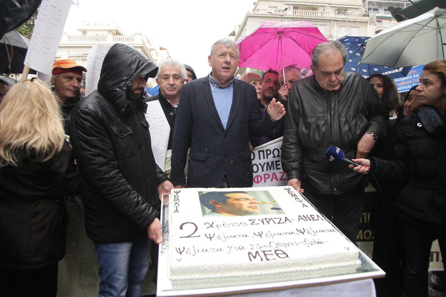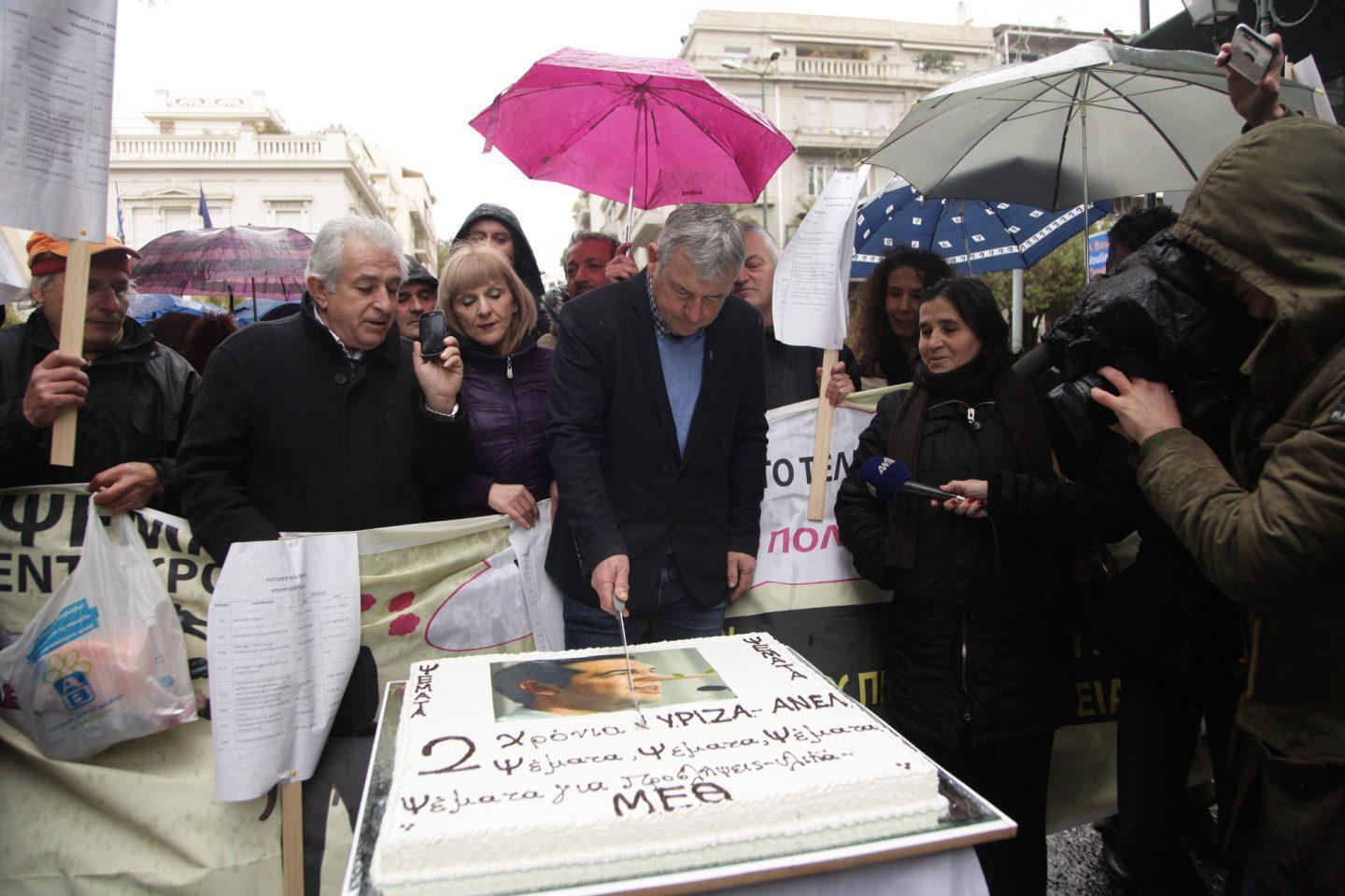 Οι εργαζόμενοι στα νοσοκομεία πάντως συνέχισαν με την διαμαρτυρία που είχαν προγραμματίσει και «γιόρτασαν» τα δύο χρόνια κυβέρνησης ΣΥΡΙΖΑ – ΑΝΕΛ στην εξουσία, φέρνοντας μάλιστα μια… τούρτα! Η τούρτα απεικόνιζε τον πρωθυπουργό ως Πινόκιο με μεγάλη μύτη από τα ψέμματα και έγραφε: «Δύο χρόνια ΣΥΡΙΖΑ – ΑΝΕΛ: Ψέμματα, ψέμματα, ψέμματα».