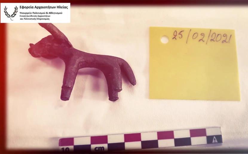 Σύμφωνα με ανακοίνωση του υπουργείου, το μικρό ακέραιο ειδώλιο εντοπίστηκε χάρις στην παρατηρητικότητα της αρχαιολόγου Ζαχαρούλας Λεβεντούρη πλησίον του Ναού του Διός στην Ιερή Άλτη της Ολυμπίας καθώς το ένα κέρατό του εξείχε από την επιφάνεια του εδάφους, έπειτα και από τις πρόσφατες έντονες βροχοπτώσεις. Αφαιρέθηκε αμέσως μετά τον εντοπισμό του και μεταφέρθηκε στα εργαστήρια όπου έτυχε της φροντίδας των συντηρητών της Εφορείας Αρχαιοτήτων Ηλείας. Τώρα αναμένει καθαρό τους αρχαιολόγους να το μελετήσουν ενδελεχώς και να το εντάξουν τυπολογικά και χρονολογικά.