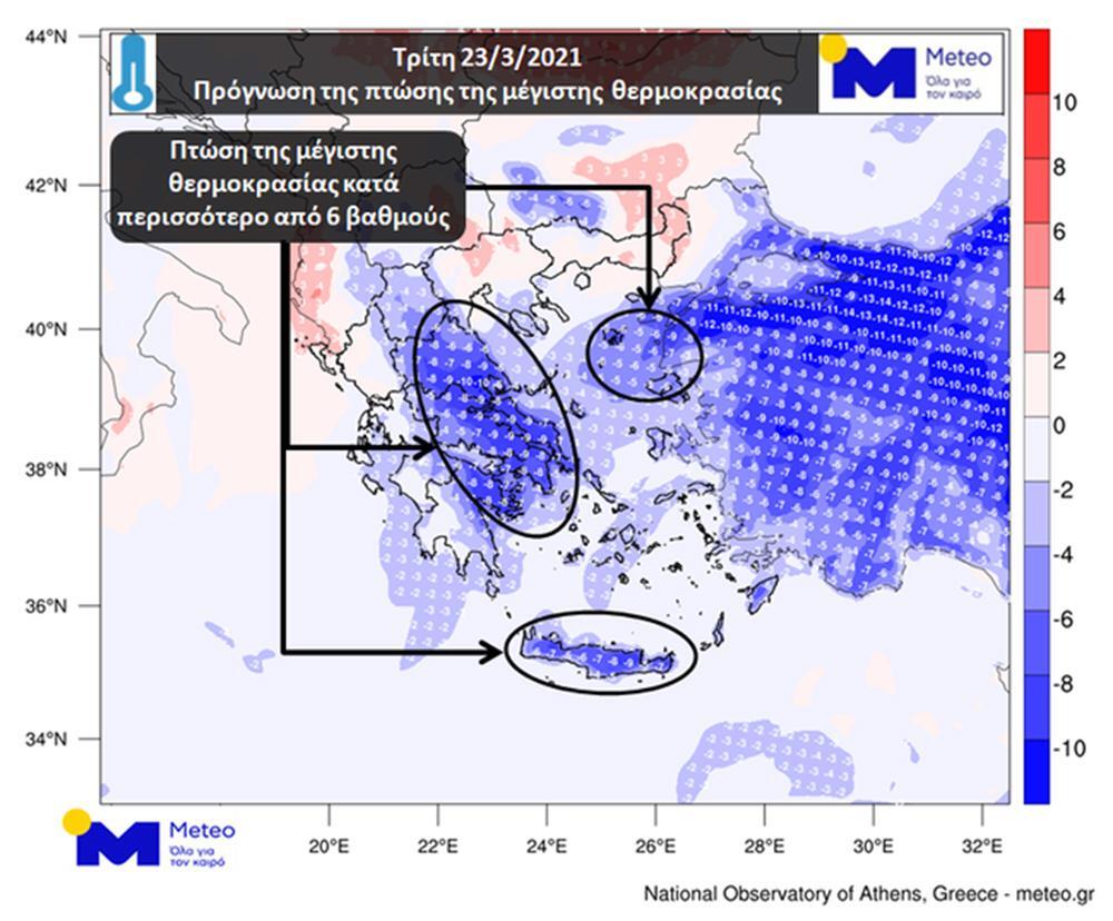 Ενισχυμένοι θα είναι οι βόρειοι άνεμοι στα πελάγη, φτάνοντας πρόσκαιρα κατά τόπους τα 8 μποφόρ και τα 6 μποφόρ στο Ιόνιο. Η θερμοκρασία θα παρουσιάσει σημαντική πτώση στα ανατολικά ηπειρωτικά, στο Αιγαίο και στην Κρήτη, κυρίως ως προς τις μέγιστες τιμές της, οι οποίες κατά τόπους αναμένεται να είναι κατά 6 έως 10 βαθμούς χαμηλότερες από αυτές της Δευτέρας.