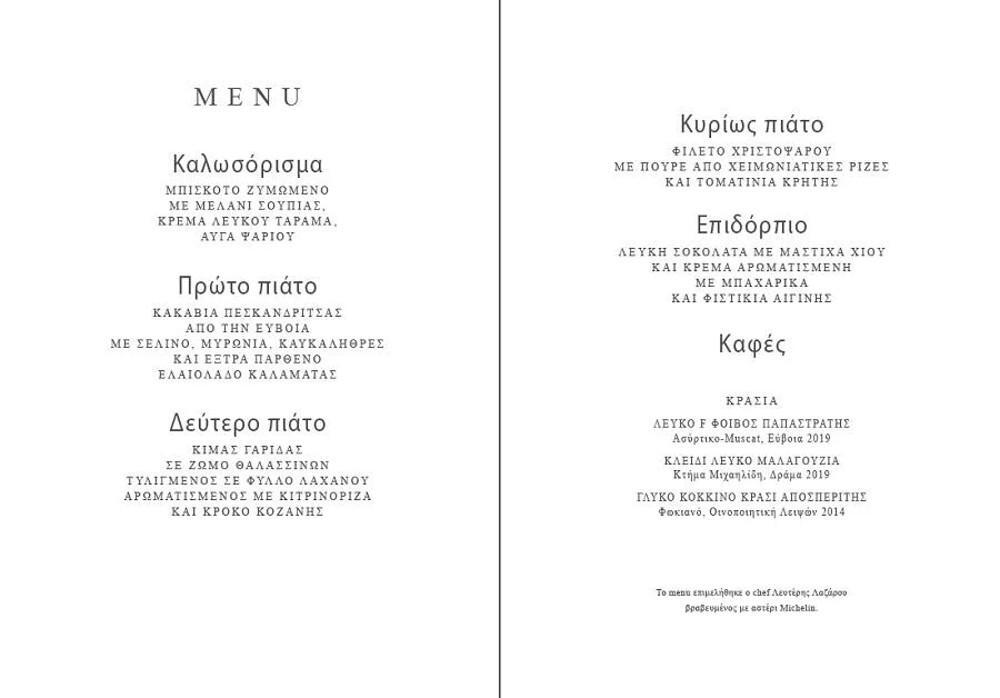 Αποκλειστικά γεύσεις της θάλασσας με έμφαση στα ελληνικά προϊόντα θα κυριαρχούν -λόγω και Σαρακοστής- στο δείπνο που θα παραθέσει η Πρόεδρος της Δημοκρατίας, Κατερίνα Σακελλαροπούλου, για τα 200 χρόνια από την ελληνική επανάσταση, με την υπογραφή του Λευτέρη Λαζάρου.