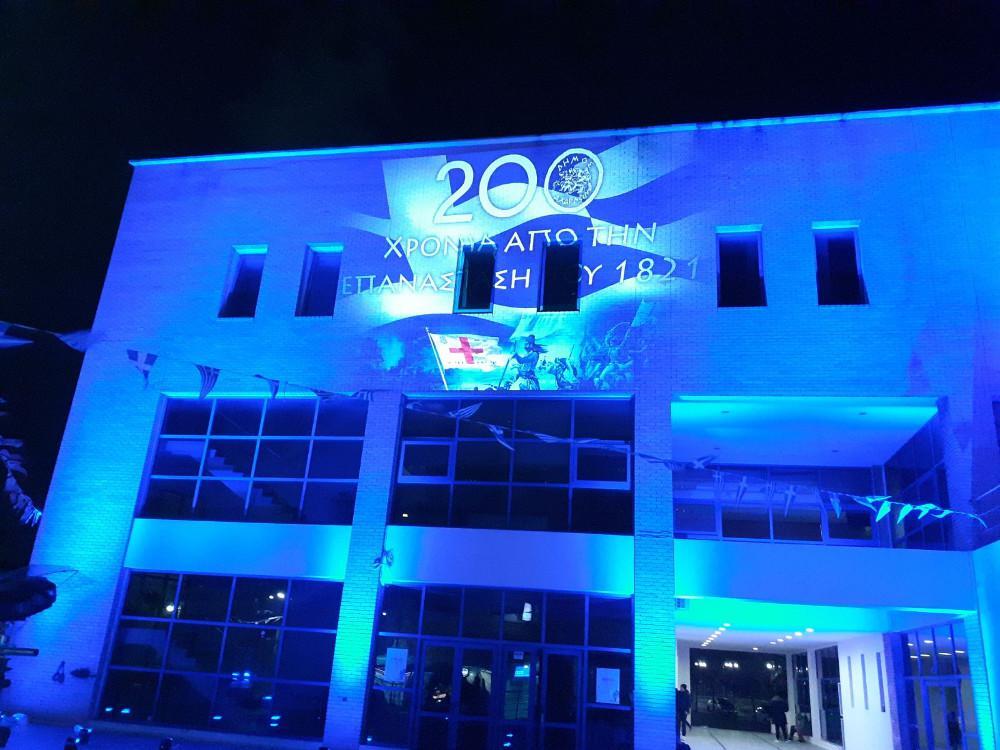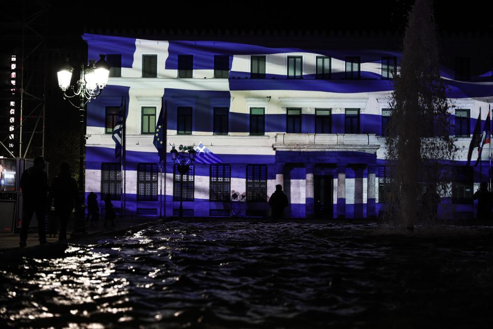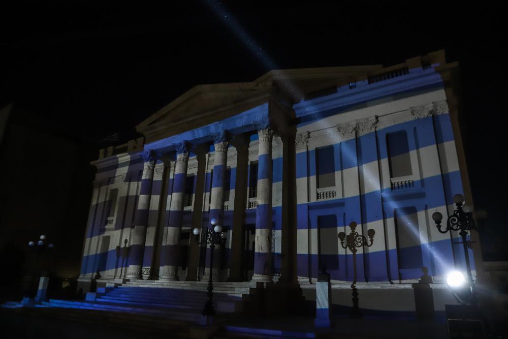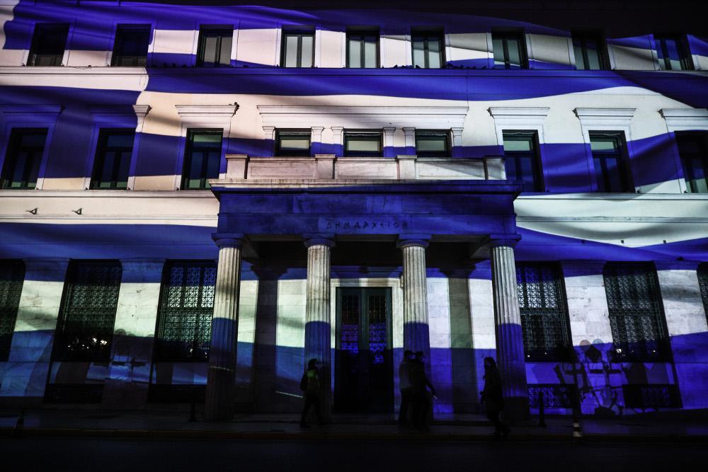 Με τα χρώματα της ελληνικής σημαίας ντύθηκε το Δημαρχείο της Αθήνας.